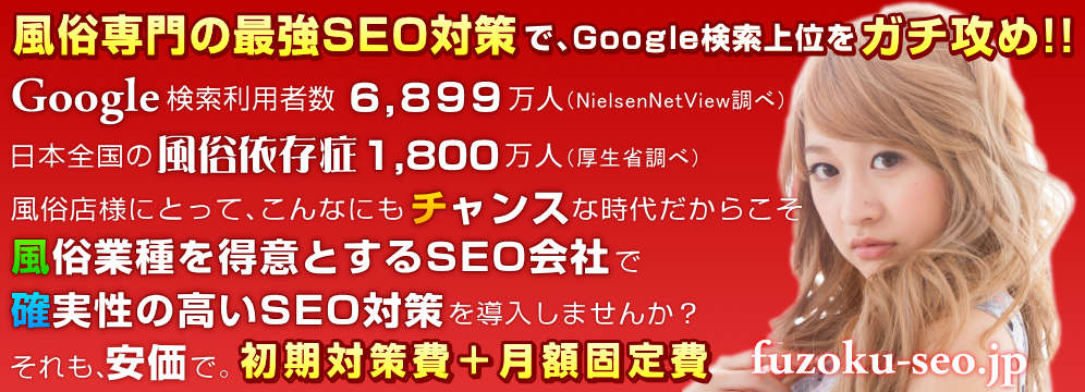 風俗SEO対策.JPを運営するPROMOTION-AGENTグループでは、創業以来より総計800サイト以上の風俗サイト様のSEO対策などをお受けさせていただき、「風俗」「ガールズバー」「キャバクラ」「セクキャバ」「ヘルス」「イメクラ」「ソープランド」「高収入アルバイト」「風俗求人」「ホストクラブ」などといった、風俗業界に欠かせない語句を含む総計12,500キーワード以上のSEO対策を行なってまいりました。